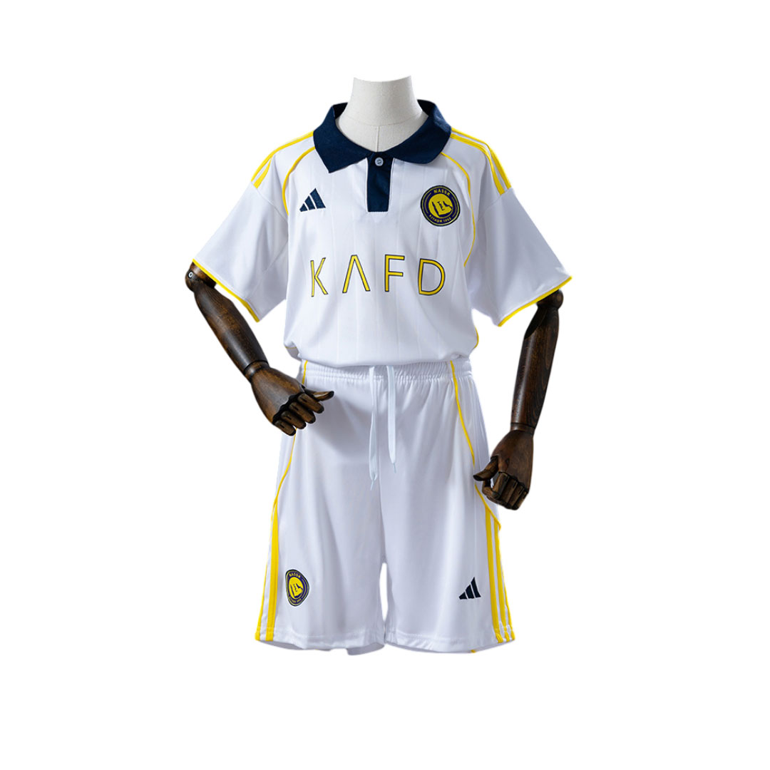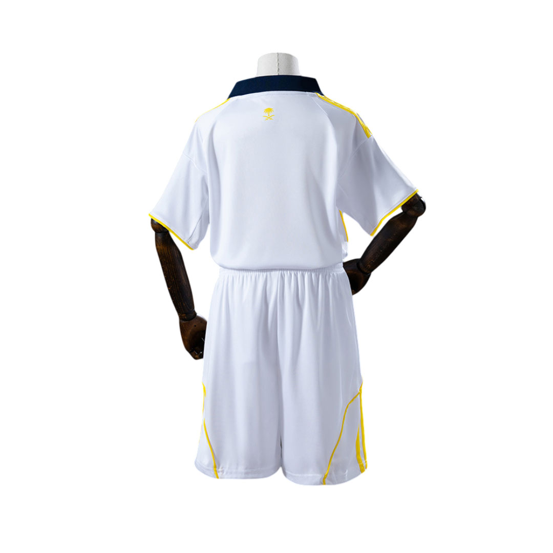 Nový Al-Nassr 25/26 Tretí Dres prináša elegantný a čistý vzhľad, ktorý kombinuje jemný off-white odtieň s výraznými detailmi v tmavomodrej a žltej. Dominantným prvkom je klasický polokošeľový golier v tmavomodrej farbe, ktorý dodáva dresu uhladený, takmer prémiový charakter.