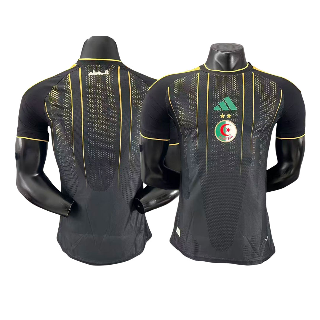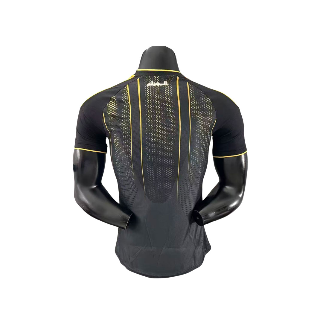 Tréningový dres Alžírsko 2026 zaujme už na prvý pohľad svojím moderným a výrazným dizajnom. Dominantný čierny základ je doplnený o jemné zlaté vertikálne línie, ktoré vytvárajú dynamický vizuálny efekt a zároveň zvýrazňujú športovú silu a eleganciu tímu.