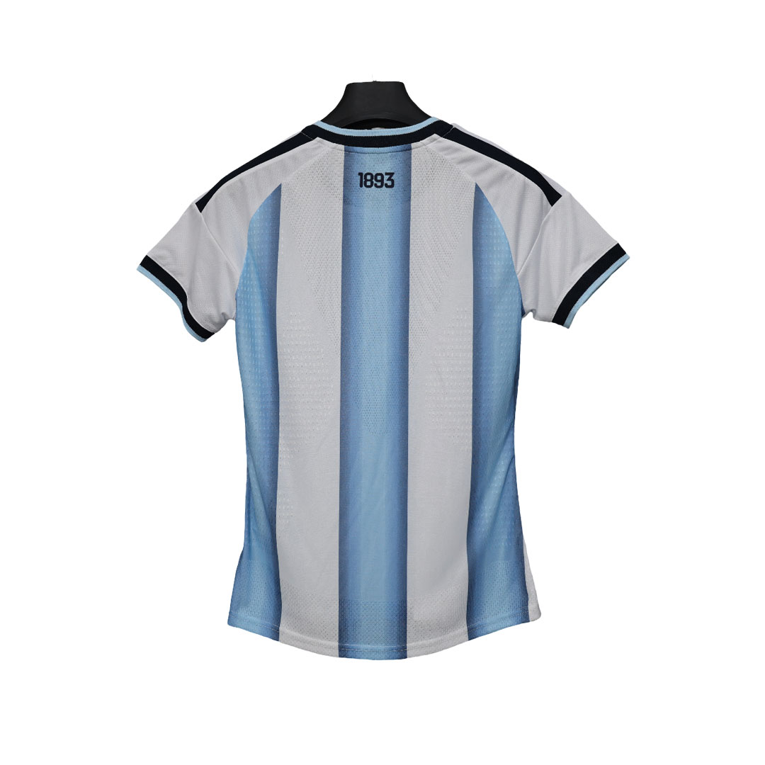 Dámsky domáci futbalový dres Argentína pre MS 2026 prináša ikonický vzhľad reprezentácie v strihu prispôsobenom pre ženy. Základ tvoria tradičné svetlomodré a biele vertikálne pruhy, ktoré sú neoddeliteľnou súčasťou identity Argentíny a patria medzi najrozpoznateľnejšie dizajny vo futbale.