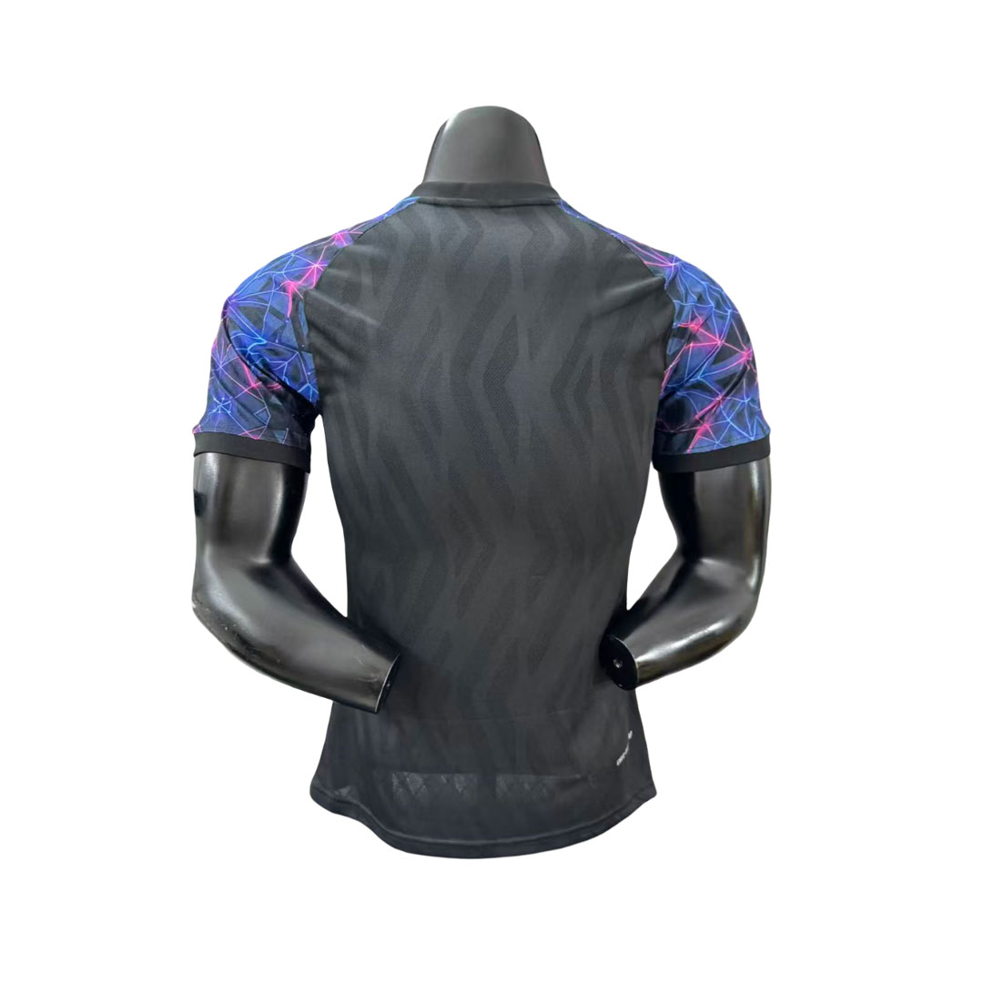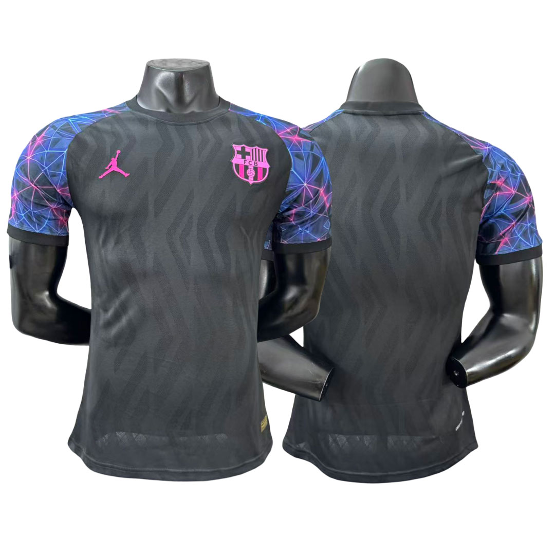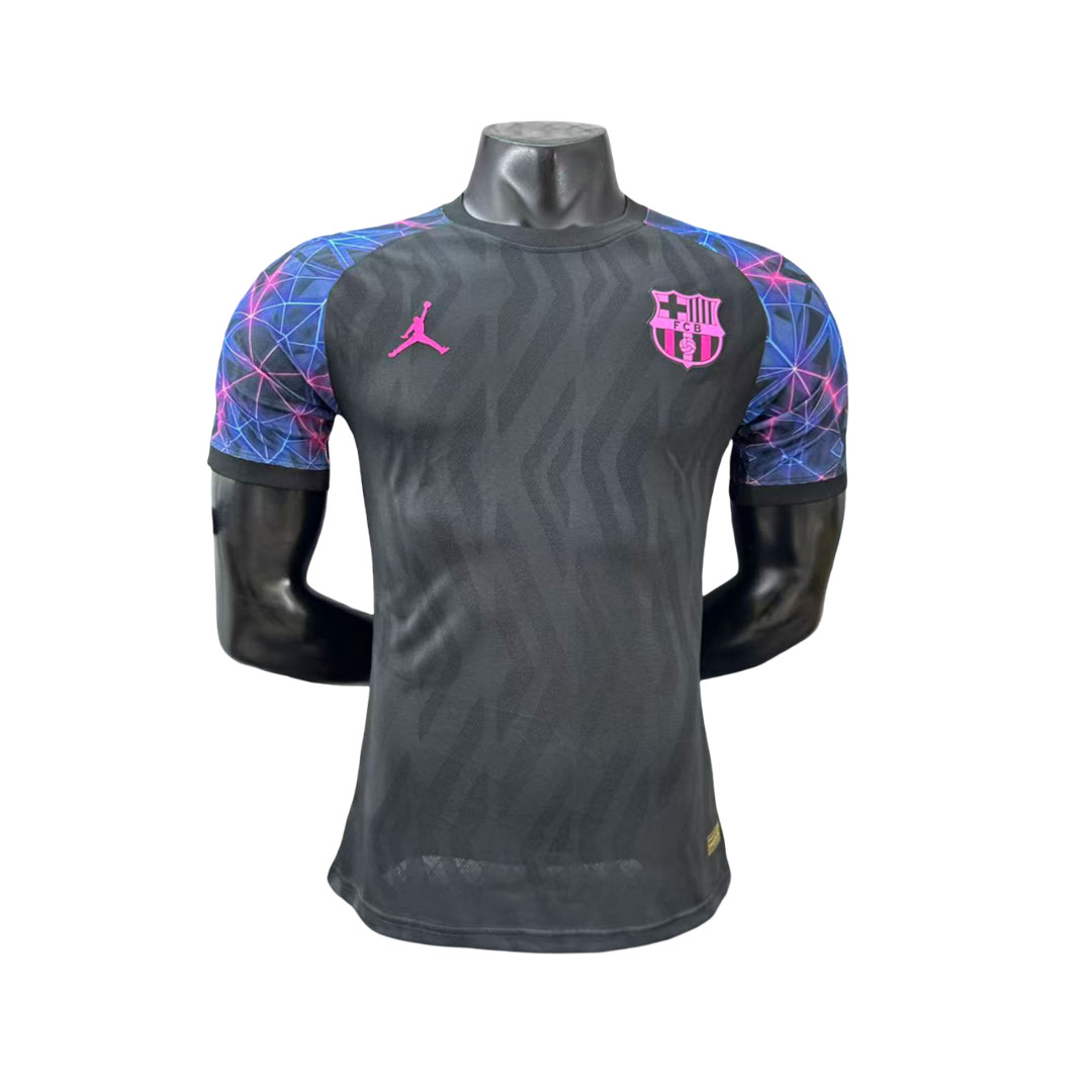 Táto špeciálna edícia dresu FC Barcelona prináša moderný a výrazný dizajn. Základ tvorí tmavosivý podklad s jemným tónovaným vzorom, ktorý dodáva dresu textúru a hĺbku. Najvýraznejším prvkom sú rukávy s geometrickým vzorom v modrých a ružových tónoch, ktoré vytvárajú dynamický kontrast k tmavému telu dresu.