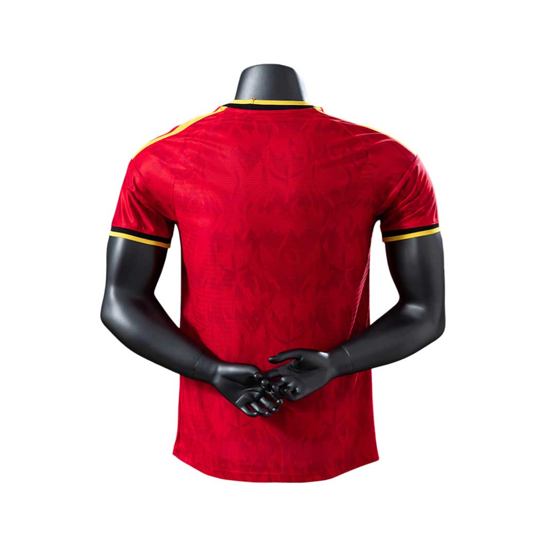 Pánsky domáci dres Belgicko MS 2026 prichádza v intenzívnej červenej farbe, ktorá je pre belgickú reprezentáciu typická. Dopĺňajú ju kontrastné prvky v zlato-žltom a čiernom tóne, vďaka čomu pôsobí dres silno, moderne a veľmi výrazne.