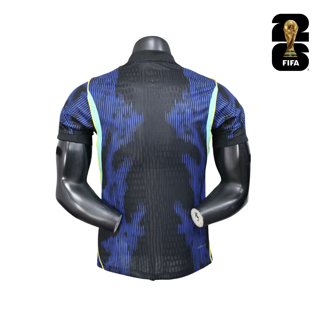 Hosťovský dres Brazília MS 2026 prichádza v výraznej kráľovsky modrej farbe, ktorú dopĺňajú čierne prvky. Výsledok je elegantný, no zároveň veľmi športový. Predná strana dresu je oživená ostrým, dynamickým vzorom, kde sa prelínajú rôzne tóny modrej. Motív pôsobí takmer abstraktne a dodáva dresu energiu aj pohyb.