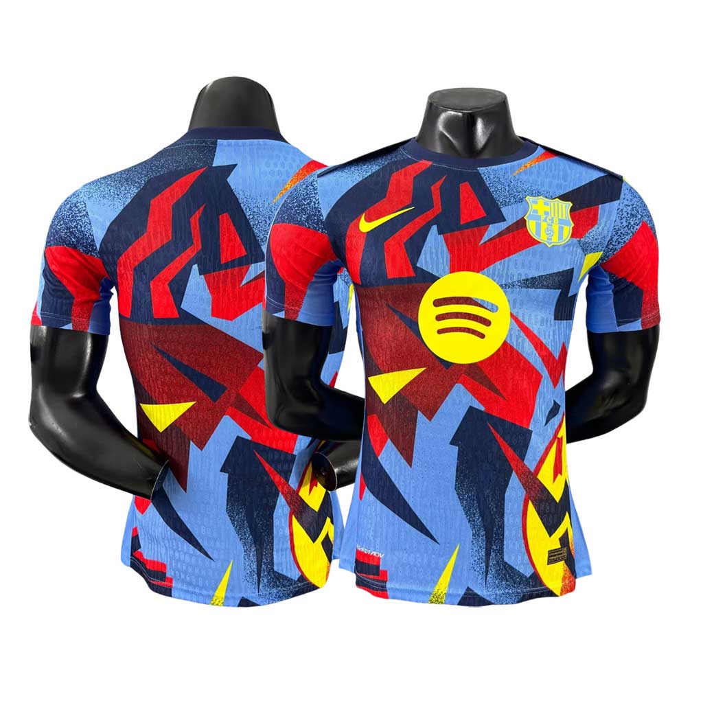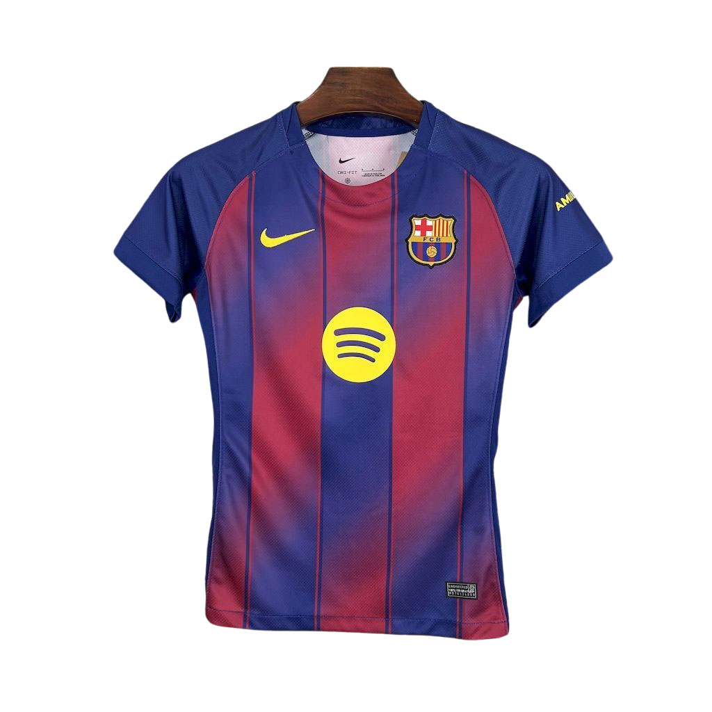 Domáci dres Dámsky FC Barcelona 2025/26 prináša moderný pohľad na klubovú tradíciu. Klasické vertikálne pruhy v bordovej a tmavomodrej farbe dostali dynamický prechodový efekt, ktorý plynulo spája farby smerom k stredu dresu a dodáva mu pohyb aj energiu. Všetky logá – vrátane loga Nike, klubového znaku a hlavného sponzora – sú zladené do kontrastnej žltej farby, čo vytvára výrazný vizuálny prvok na tmavom pozadí. Na hornej časti chrbta nechýba ani malá vlajka, ktorá spája farby klubu s katalánskou identitou – symbol hrdosti, ktorý pripomína hlboké korene FC Barcelona.