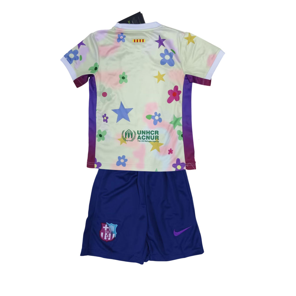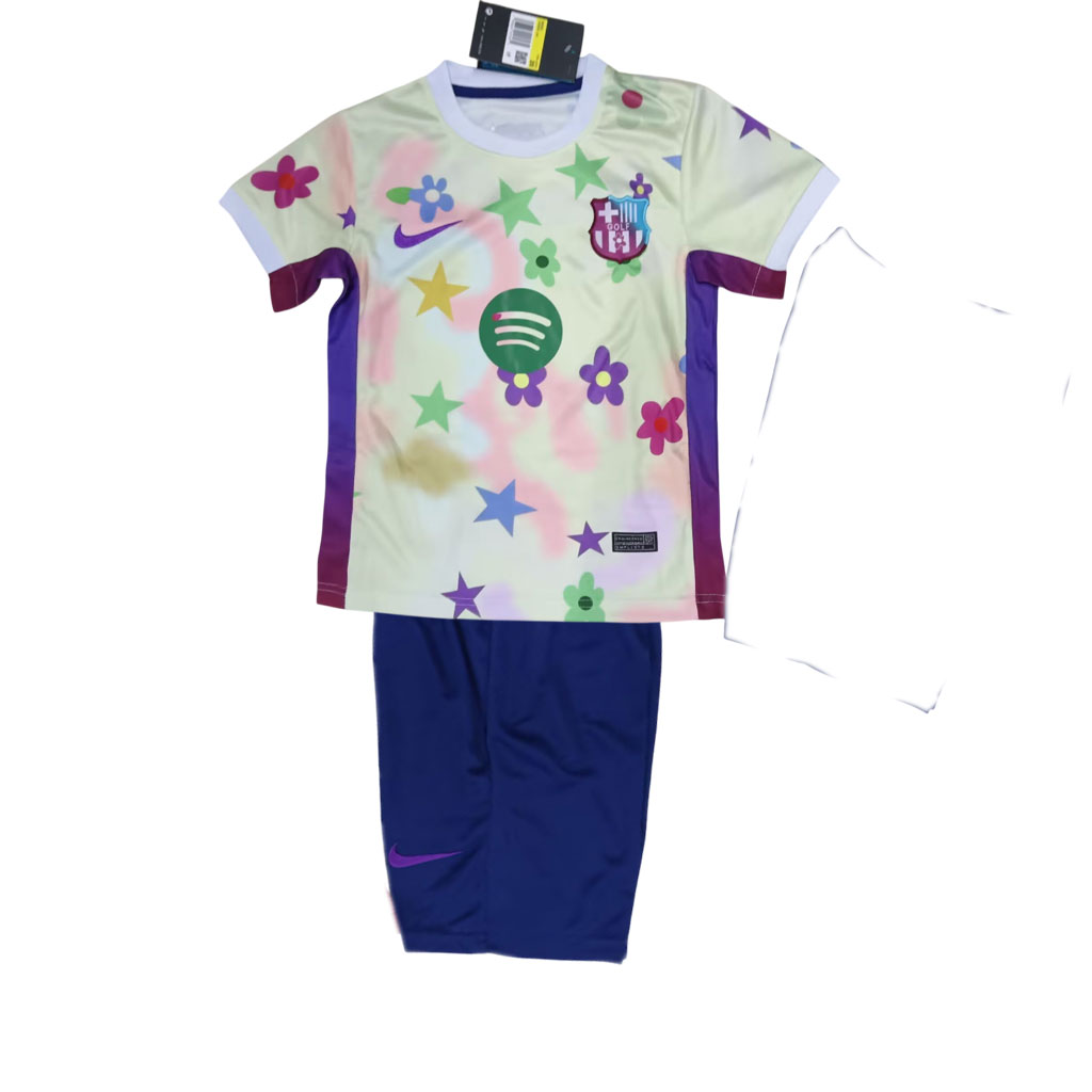 Tento detský FC Barcelona špeciálny dres 25/26 s kvetmi je naozaj výnimočný kúsok pre malých fanúšikov futbalu. Pestrofarebný dizajn s hviezdami a kvetmi prináša hravosť a radosť, no zároveň si zachováva autentické prvky ako znak klubu, logo Nike a hlavného partnera Spotify. Dres je vyrobený z ľahkého a priedušného materiálu, ktorý poskytuje pohodlie pri hraní aj každodennom nosení. Súčasťou je aj pohodlné modré šortky, ktoré celý outfit dopĺňajú.