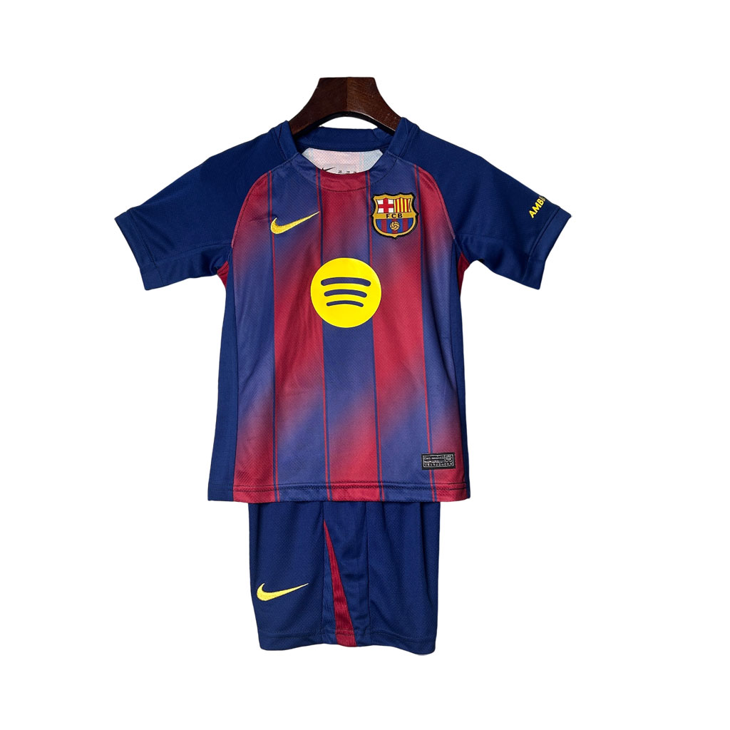 Dres NK FC Barcelona na sezónu 2025/26 prináša originálny dizajn s tradičnými červenými a tmavomodrými vertikálnymi pruhmi, ktoré sa smerom k stredu plynule prelínajú. Všetky logá sú v žltej farbe, čo dodáva dresu výrazný kontrast.