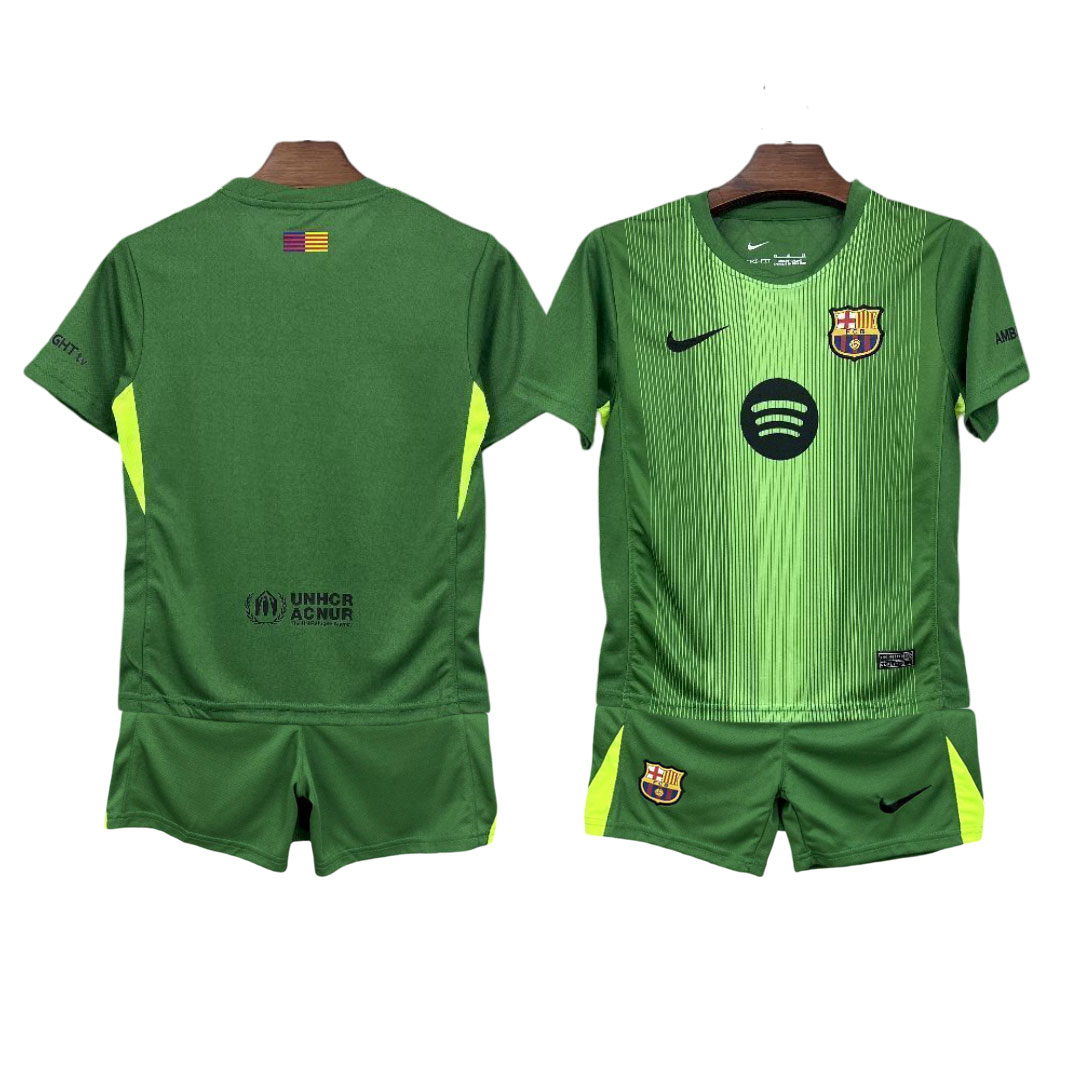 Tento detský futbalový set Barcelona v výraznom zelenom prevedení je navrhnutý v modernom brankárskom štýle, ktorý okamžite zaujme svojím energickým a technickým vzhľadom. Dres aj šortky sú farebne zladené do sýtej zelenej, ktorú dopĺňajú neónovo žlté akcenty na bokoch – detail, ktorý zvyšuje viditeľnosť a dodáva setu dynamiku.