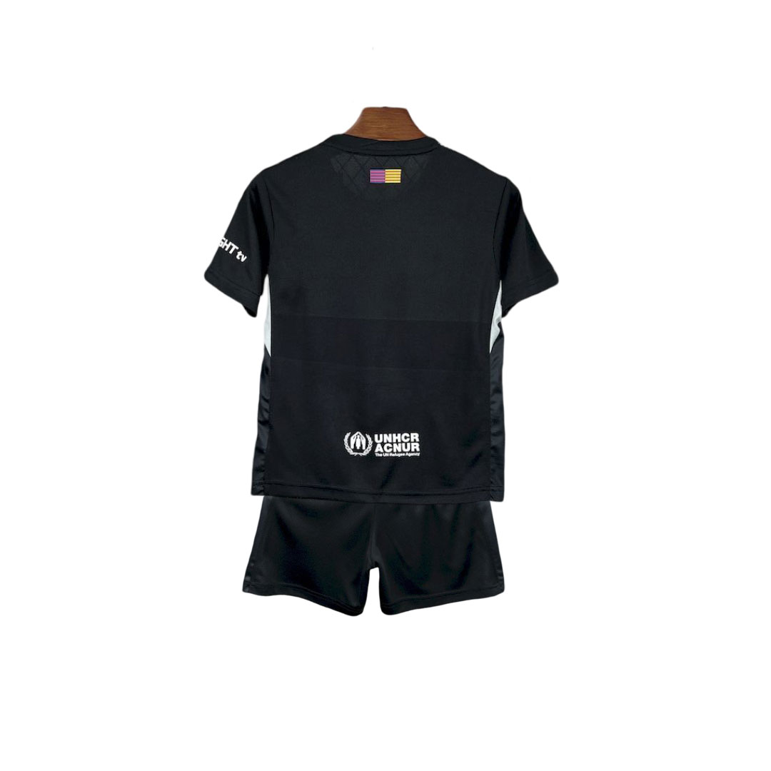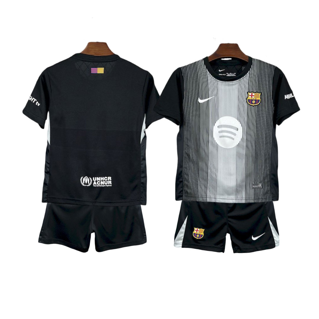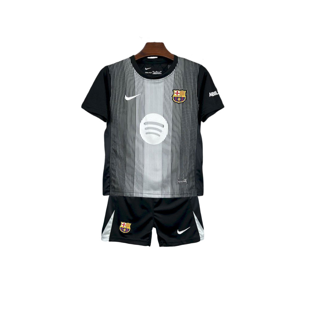 Tento detský hosťovský set FC Barcelona 2025/26 prináša moderný, technický vzhľad, ktorý jasne odlišuje tento dres od tradičných farebných kombinácií klubu. Dominantná čierna farba vytvára elegantný a sebavedomý základ, zatiaľ čo jemné zvislé biele prúžky na prednej strane dodávajú dresu hĺbku a dynamiku.