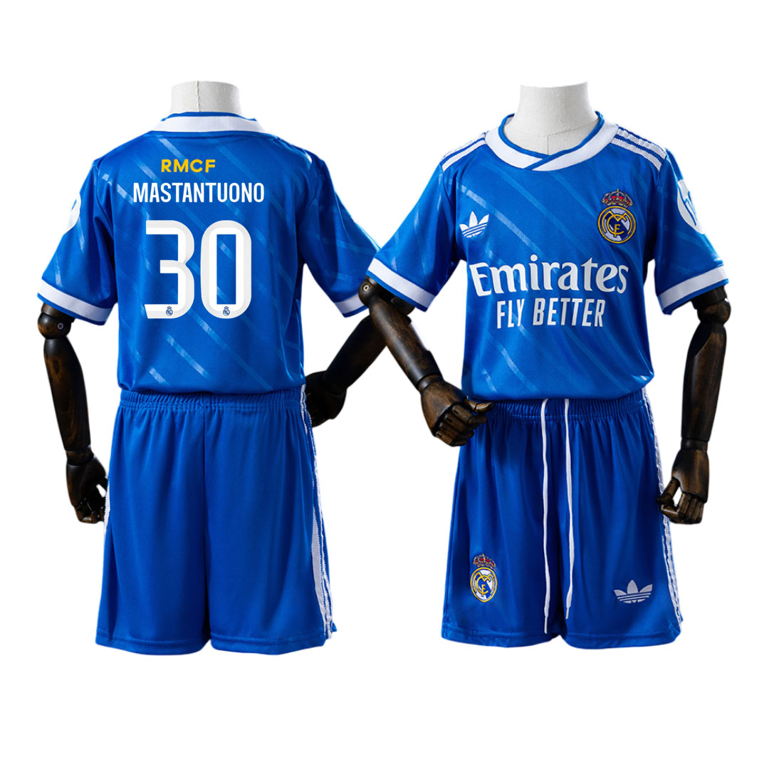 Real Madrid Detská Futbalová Súprava (dres + šortky) už obsahuje potlač mena a čísla „ARDA GÜLER #15“. Všetko je zahrnuté v cene a priamo natlačené na drese, takže pri objednávke nemusíte nič dopĺňať ani vyberať – stačí si len zvoliť správnu veľkosť.