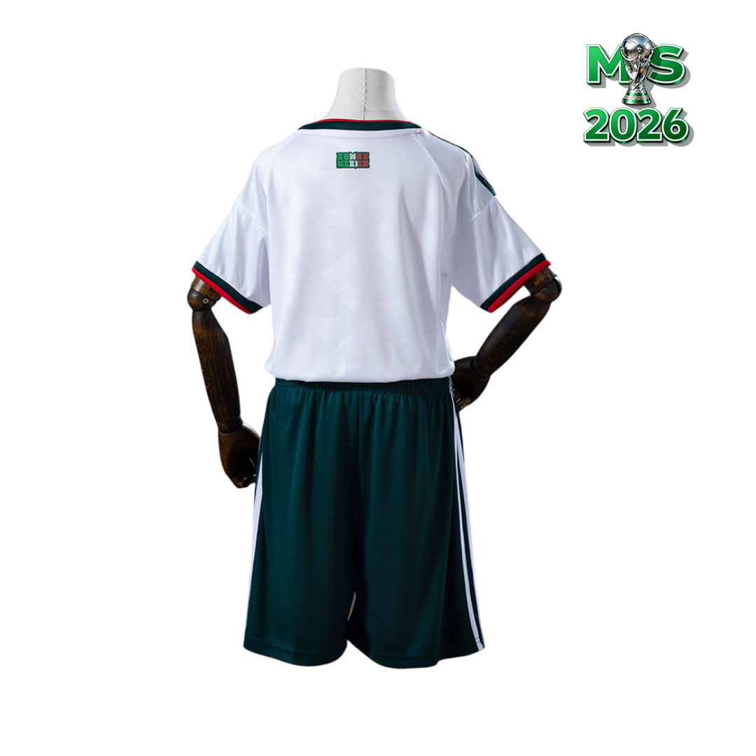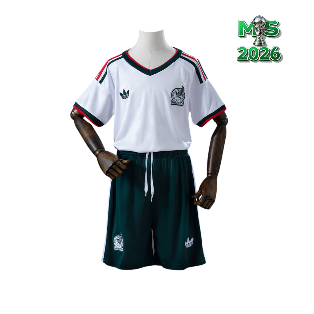 Dres je postavený na čisto bielom základe, ktorý dopĺňa jemný geometrický vzor vtlačený do látky. Motív vychádza zo starovekých mezoamerických kultúr a dodáva tričku decentný, ale veľmi pôsobivý charakter. Golier v tvare výrazného „V“ a rukávové lemy kombinujú tmavozelený (takmer antracitový) a červený odtieň, čo vytvára typický mexický kontrast.