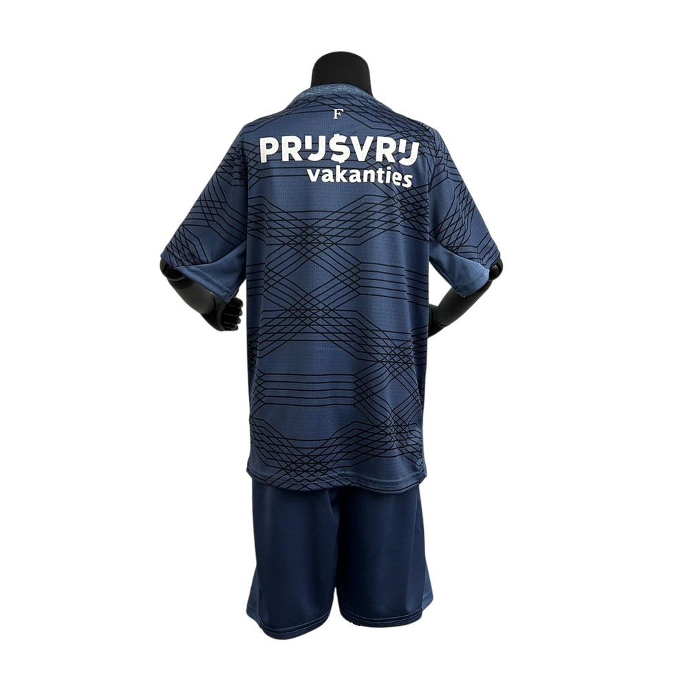 Na hrudi nechýba monochromatický znak Feyenoordu spolu s jednou bielou hviezdou, ktoré podčiarkujú klubovú identitu. Sponzorské logá sú spracované v čistej bielej farbe, čím celok pôsobí vyvážene a moderne. Tento dres spája silu, štýl a energiu – presne to, čo fanúšikovia od Feyenoordu očakávajú.