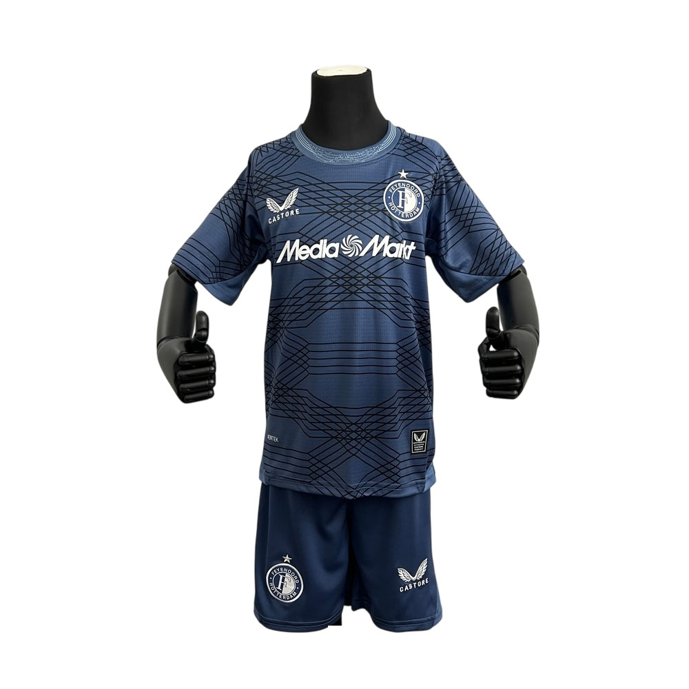 Feyenoord 25-26 vonkajší dres od značky Castore púta pozornosť elegantným tmavomodrým základom, ktorý oživuje výrazný grafický vzor po celej ploche trička. Jemné svetlomodré akcenty na vzore, golieri a rukávoch vytvárajú kontrast a dodávajú dresu svieži, dynamický charakter.