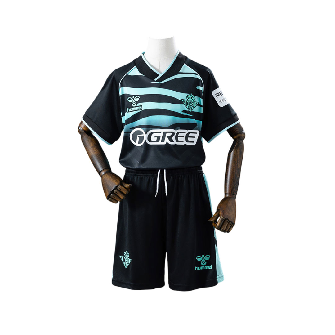 Tretí dres Real Betis 25-26 od Hummel prináša výrazný, moderný vzhľad postavený na čiernom základe. Kontrastné akcenty v jemnej mintovej farbe na golieri, ramenách a manžetách dodávajú dresu svieži a dynamický výraz.