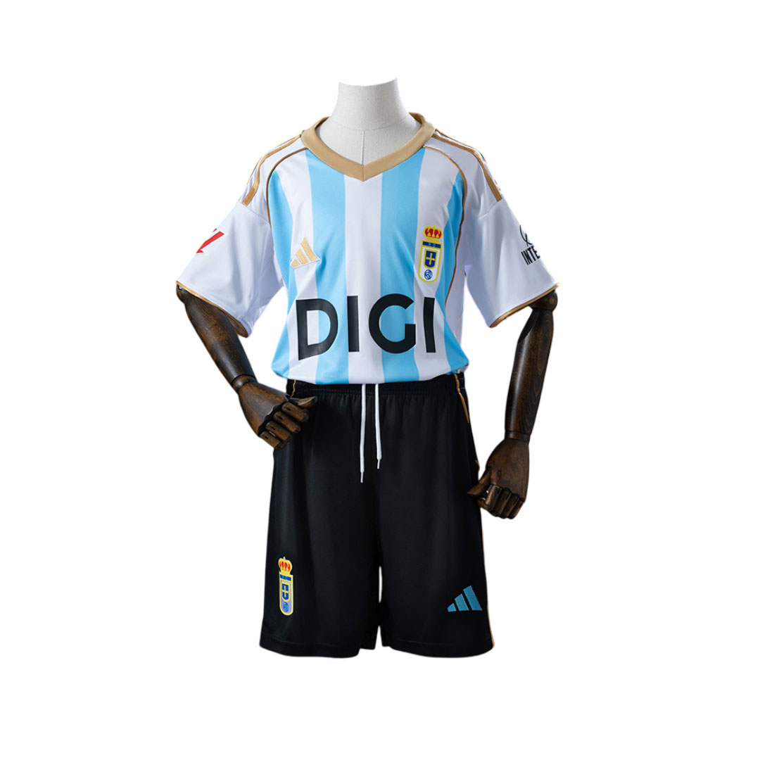 Real Oviedo 2025/26 Tretí dres prináša svetlejší, svieži vzhľad, ktorý sa opiera o históriu klubu. Striedajúce sa svetlomodré a biele pruhy odkazujú na emblém Real Club Deportivo Oviedo – jedného z pôvodných zakladajúcich klubov. Celý dizajn tak nesie myšlienku „Los Orígenes del Legado“, teda prepojenie medzi minulosťou a súčasnou identitou Real Oviedo.
