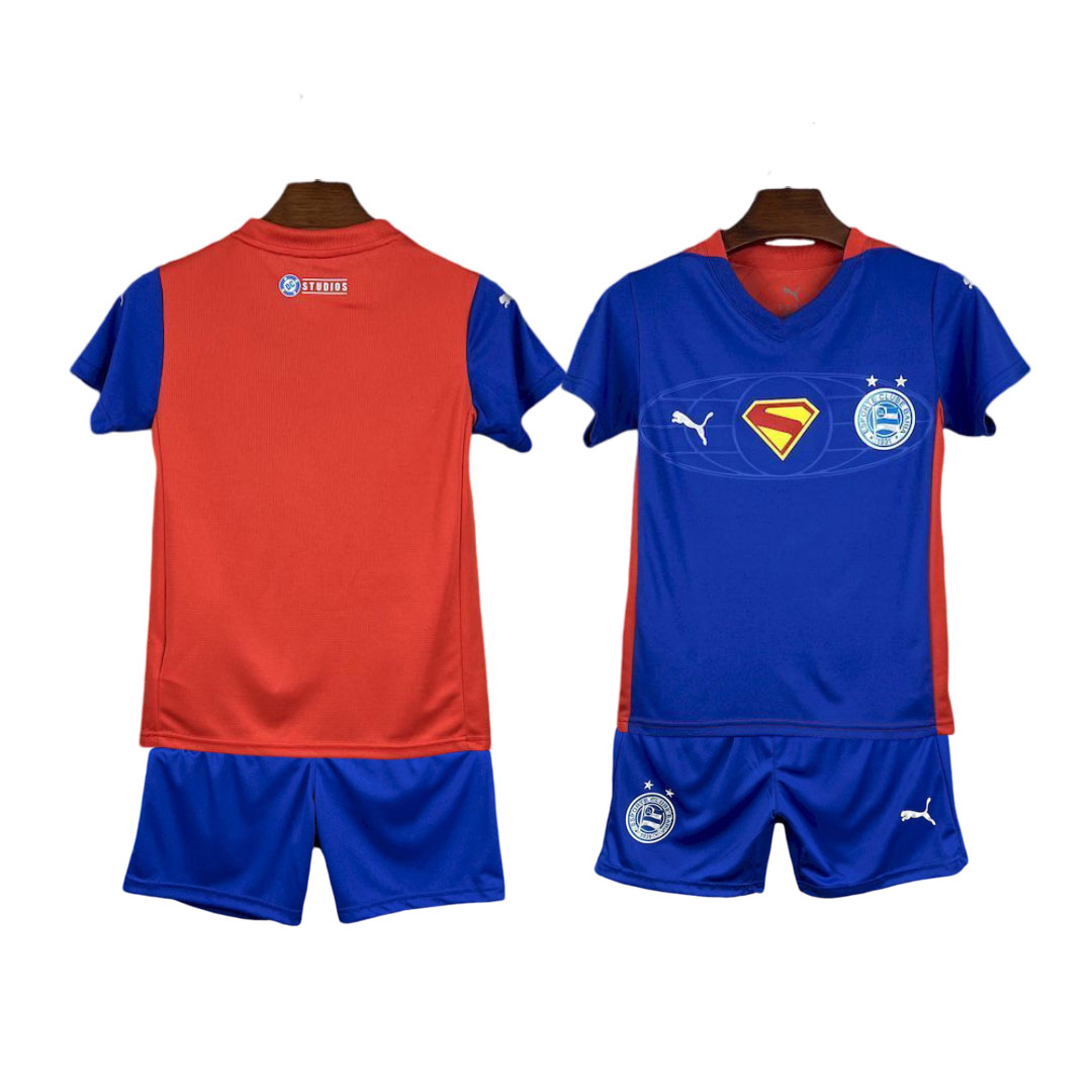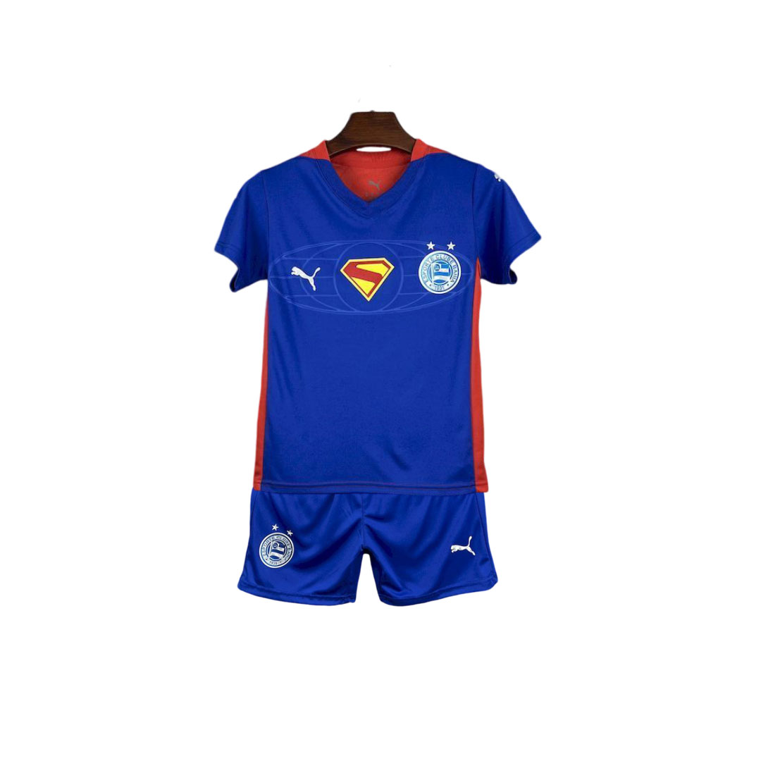 Špeciálna edícia EC Bahia 2025 prináša výrazný dizajn, ktorý si fanúšik okamžite zapamätá. Základom je sýta modrá farba, doplnená o červené bočné panely a detaily, čo vytvára silný kontrast a jasný vizuálny odkaz na tému Superman.