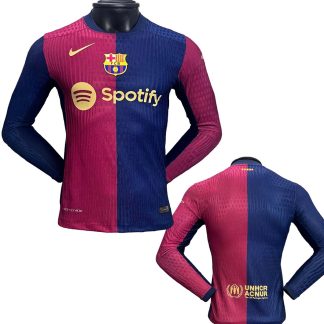 Na hrudi sa nachádza ikonický znak FC Barcelona v bledomodrom prevedení a výrazné logo sponzora Spotify v tmavomodrej farbe, ktoré krásne kontrastuje s celkovou farebnou paletou. Rukávy sú zakončené tmavými manžetami, ktoré celkový dizajn vyvážene uzatvárajú.