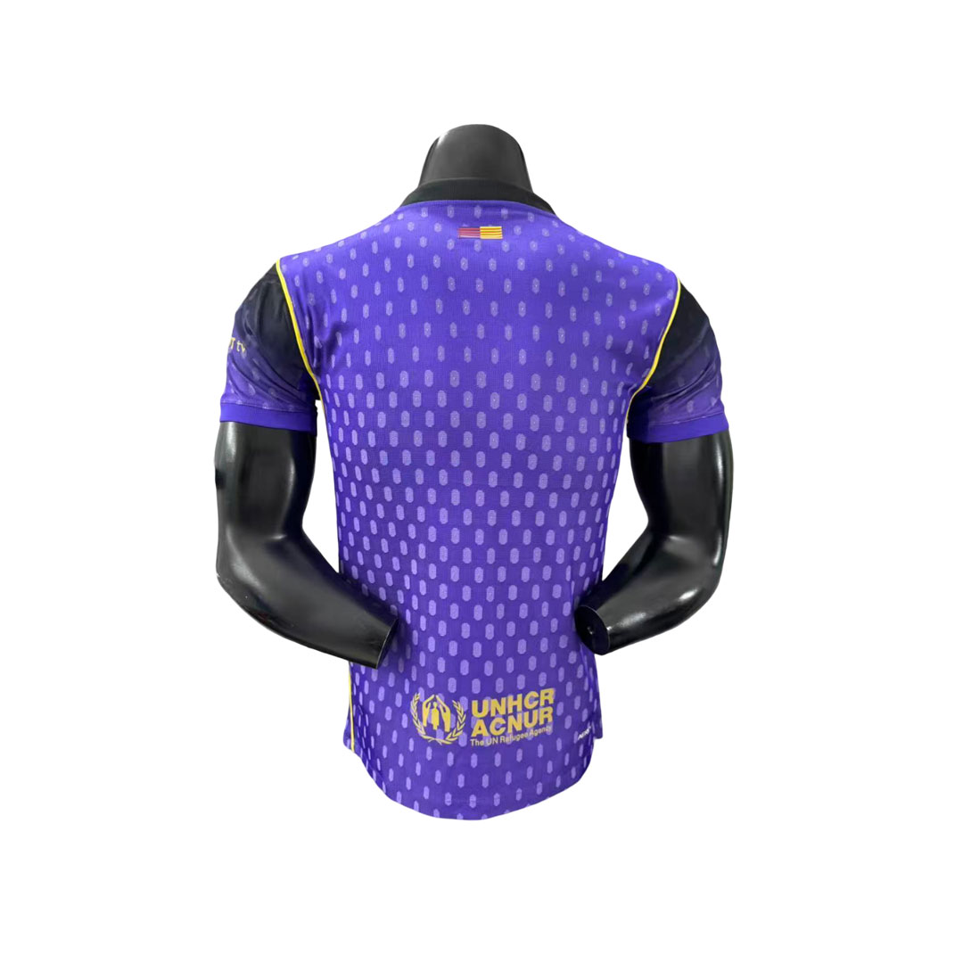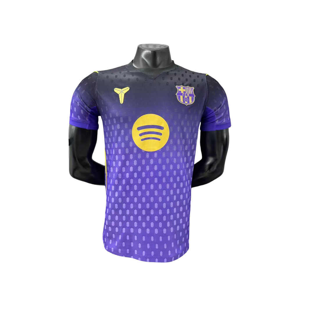 Hosťovský dres FC Barcelona 26/27 prichádza v netradičnom prevedení Field Purple, ktoré dopĺňajú elegantné zlaté detaily a logá. Táto kombinácia farieb jemne odkazuje na ikonickú fialovo-zlatú vo svete basketbalu, zároveň pripomína legendárnu postavu Kobeho Bryanta, ktorej meno je s týmto farebným štýlom historicky späté.