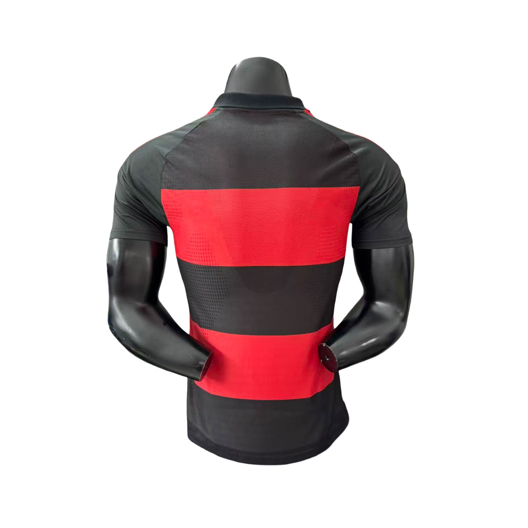 Domáci dres CR Flamengo pre sezónu 2026 zostáva verný jednej z najikonickejších kombinácií vo futbale – čierno-červeným horizontálnym pruhom, ktoré sú symbolom klubu z Ria de Janeiro už celé desaťročia. Základ dresu tvorí čierne telo doplnené výraznými červenými pruhmi, zatiaľ čo biele aplikácie loga a detailov vytvárajú čistý kontrast a dodávajú dizajnu moderný charakter.
