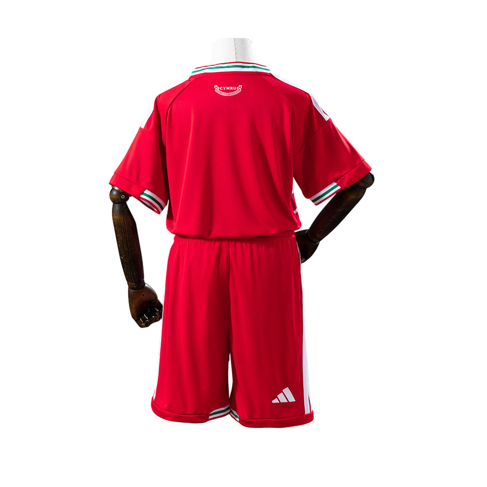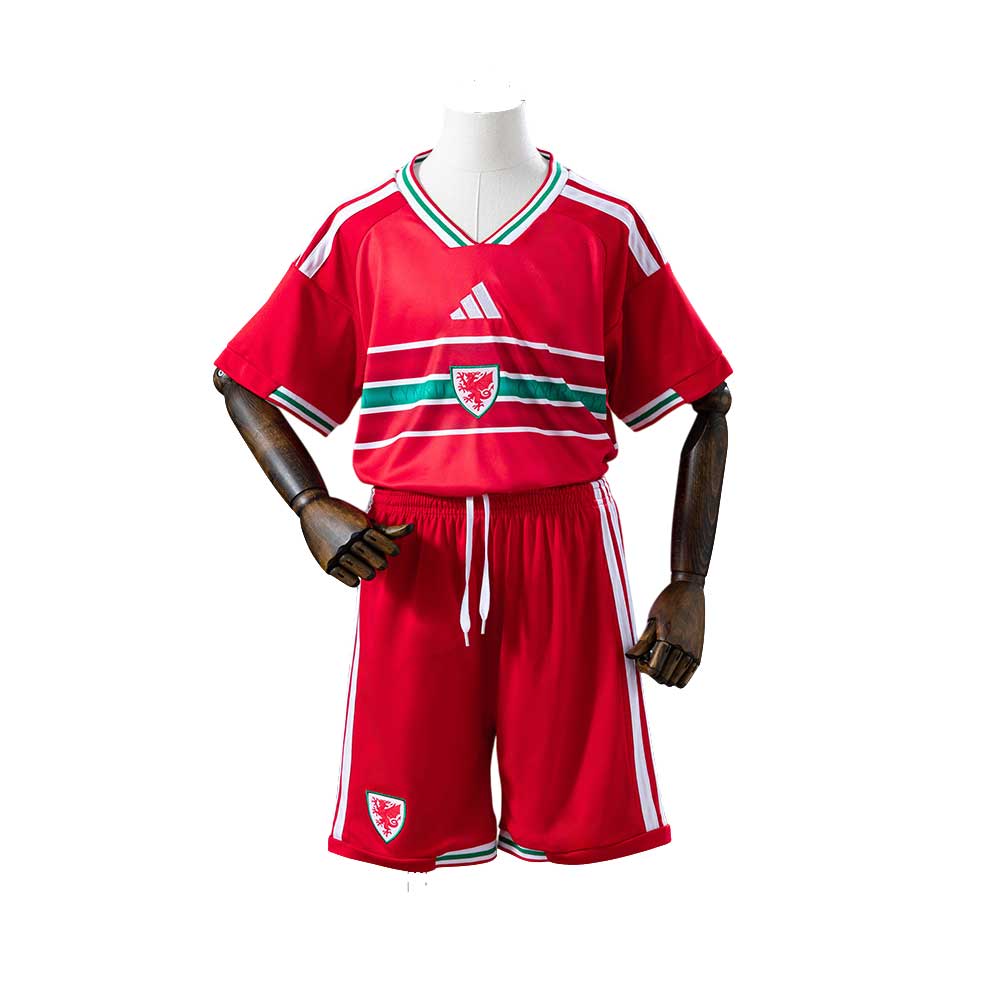 Na hrudi prechádza výrazný horizontálny pruh v bielej a zelenej, ktorý pripomína farby waleskej vlajky a dodáva dresu jasnú vizuálnu identitu.