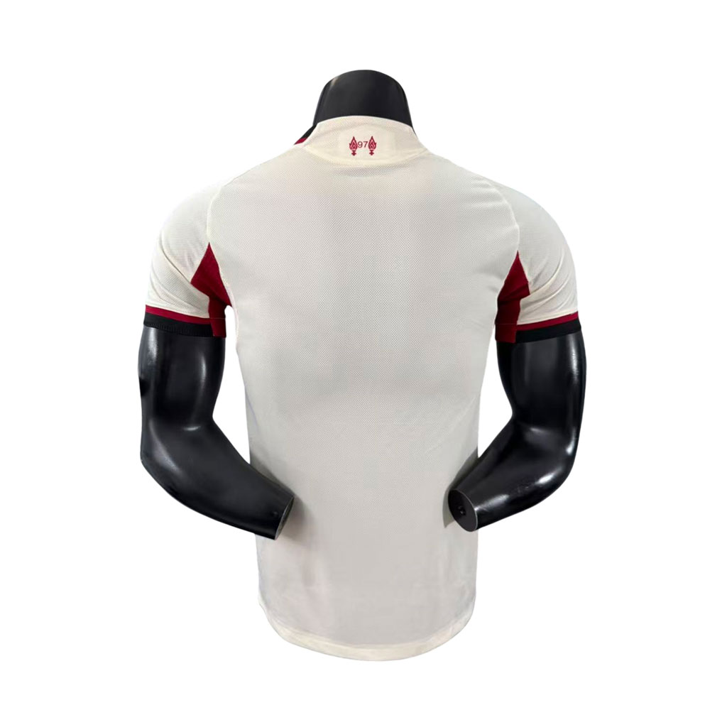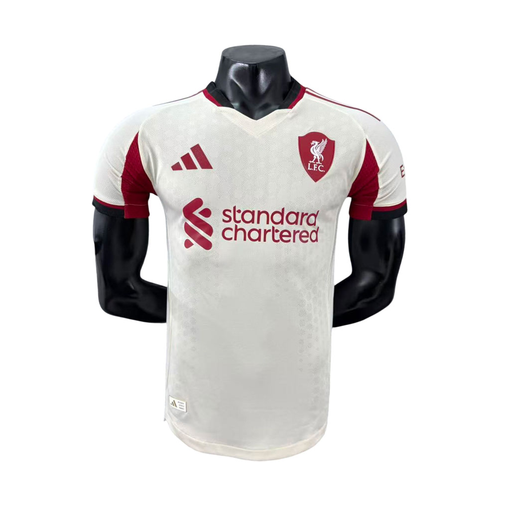 Hosťovský dres Liverpool od Aidas na sezónu 2025/26 je ladený najmä do odtieňa smotanovej bielej, ktorú značka oficiálne nazýva „Wonder White“. Elegantnú svetlú základnú farbu dopĺňajú čierne detaily a pravdepodobne aj jemné akcenty červenej.