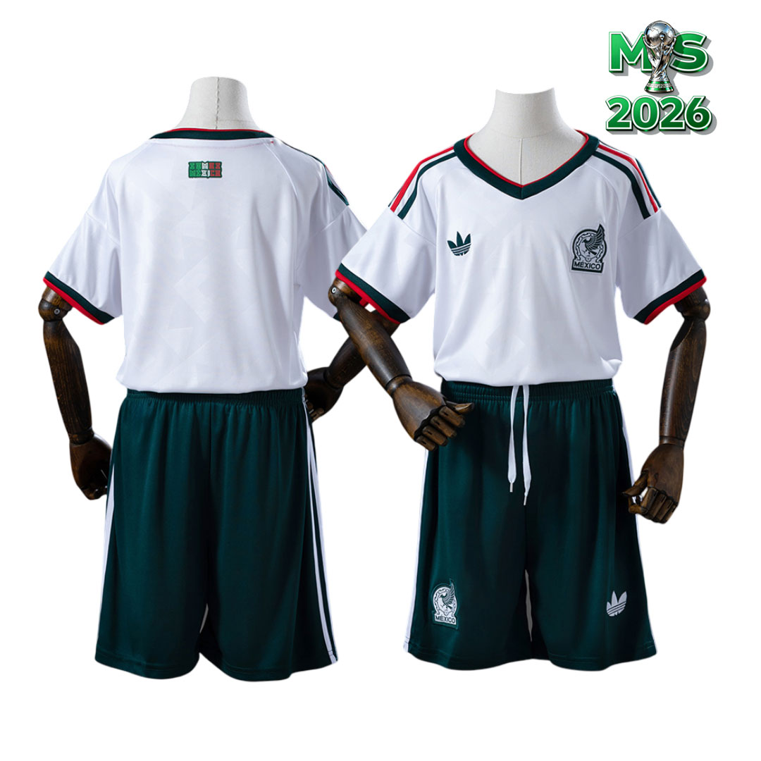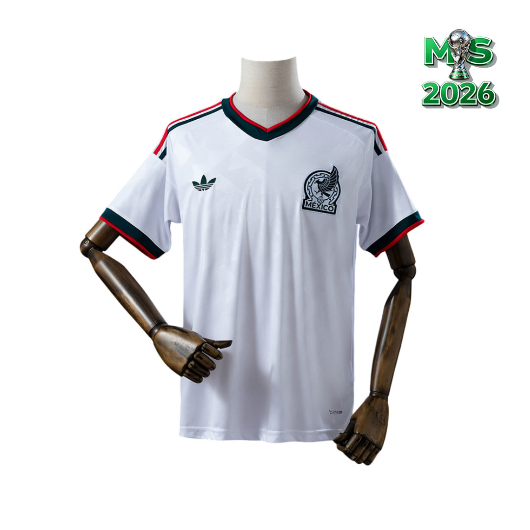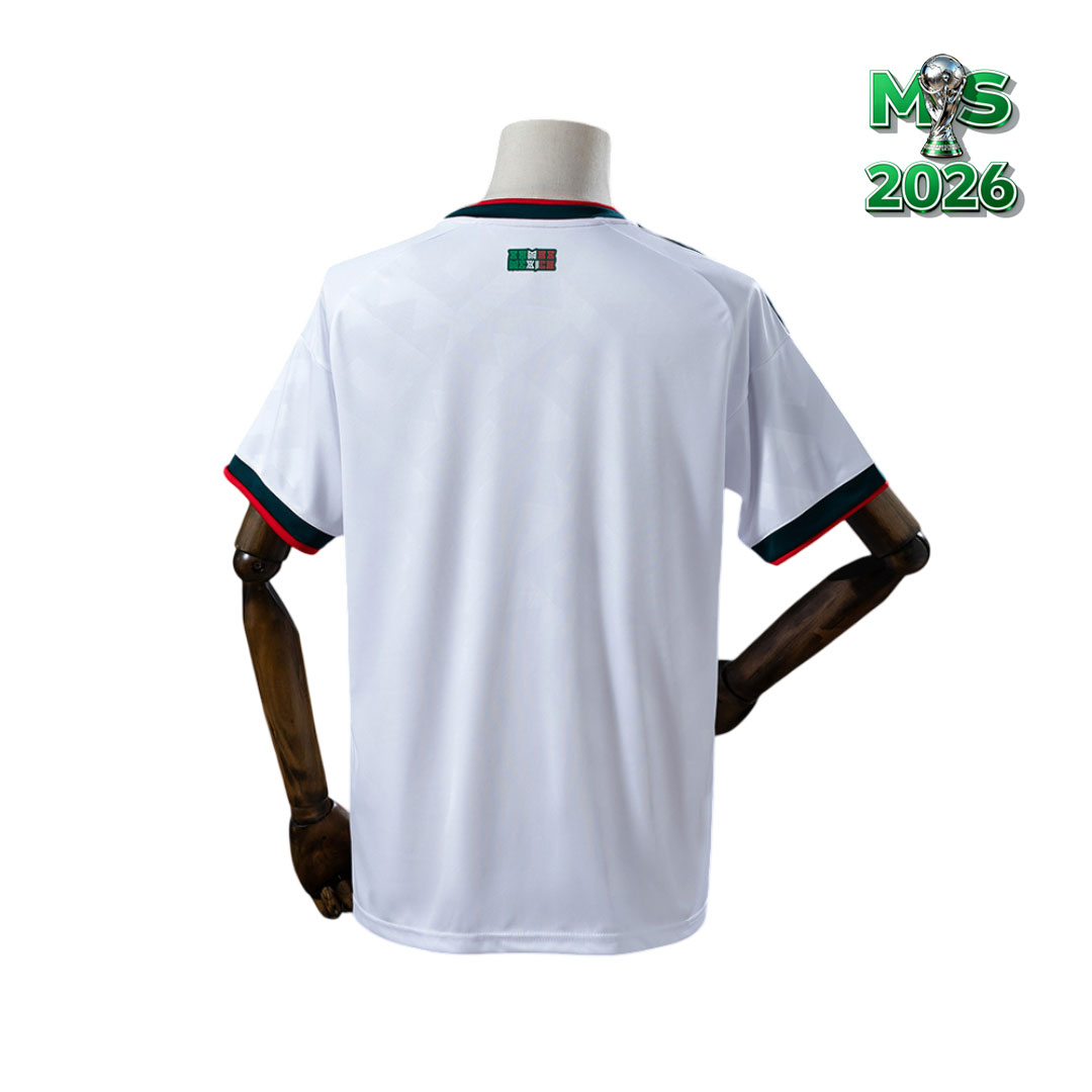 Dres je postavený na čisto bielom základe, ktorý dopĺňa jemný geometrický vzor vtlačený do látky. Motív vychádza zo starovekých mezoamerických kultúr a dodáva tričku decentný, ale veľmi pôsobivý charakter. Golier v tvare výrazného „V“ a rukávové lemy kombinujú tmavozelený (takmer antracitový) a červený odtieň, čo vytvára typický mexický kontrast.