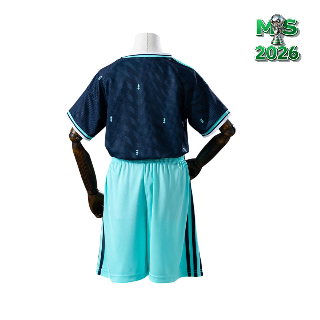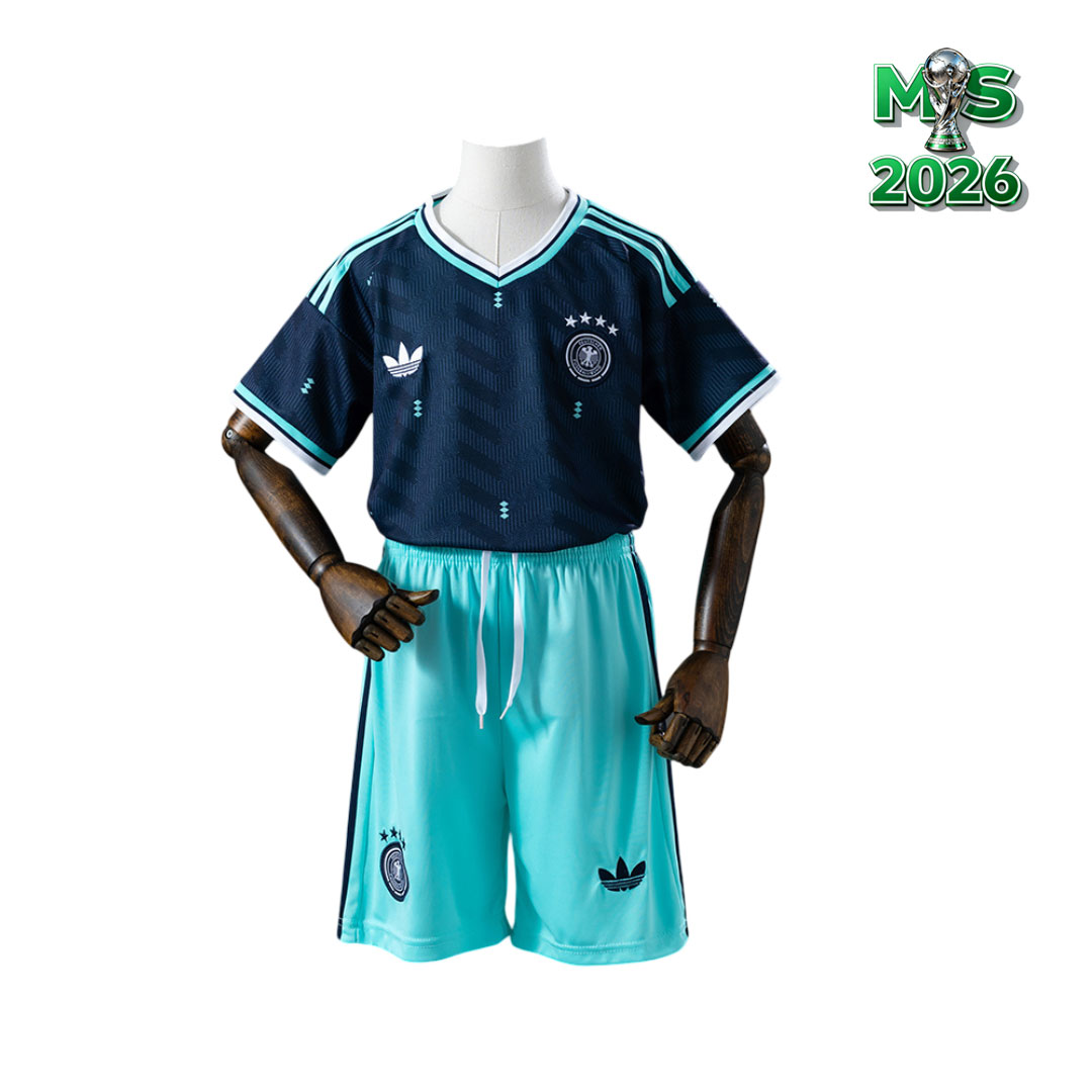 Vonkajší dres Nemecka pre Majstrovstvá sveta 2026 prichádza v farebnej kombinácii, akú reprezentácia doteraz nikdy nepoužila. Základ tvorí tmavomodrá farba, ktorú dopĺňajú biele logá a jemné mätové prvky – spolu vytvárajú moderný, mierne „maritime“ vzhľad.