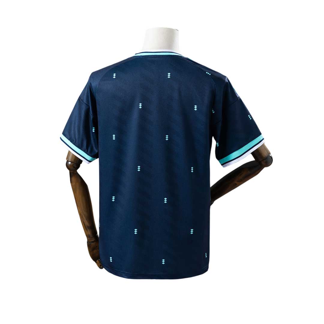 Látku pokrýva výrazný cik-cak vzor, nad ktorým sa objavujú mätové akcenty. Golier aj manžety rukávov nesú trojfarebný pásik v kombinácii biela / tmavomodrá / mint, čo dresu dodáva čistý a uhladený charakter.