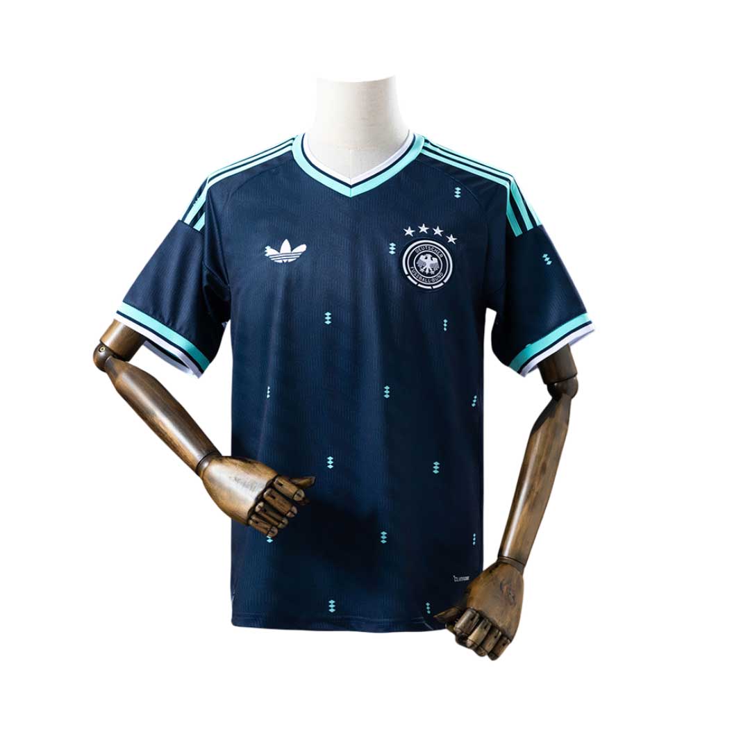Vonkajší dres Nemecka pre Majstrovstvá sveta 2026 prichádza v farebnej kombinácii, akú reprezentácia doteraz nikdy nepoužila. Základ tvorí tmavomodrá farba, ktorú dopĺňajú biele logá a jemné mätové prvky – spolu vytvárajú moderný, mierne „maritime“ vzhľad.