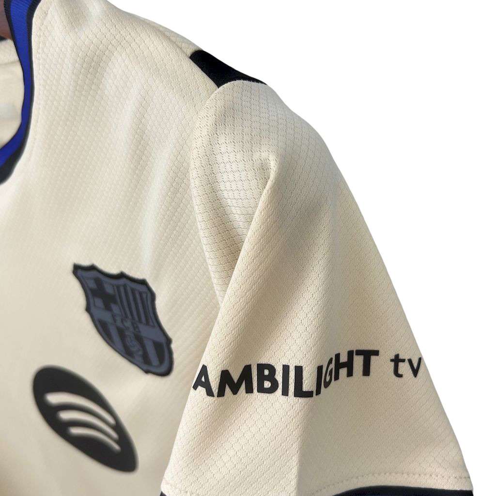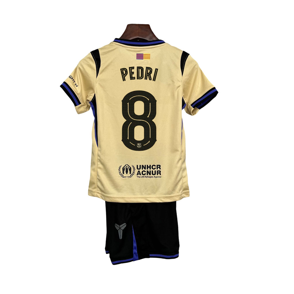 Tento detský hosťovský dres FC Barcelona 2025-26 prináša jedinečný dizajn v odtieni svetlej žlto-zlatej farby s čiernymi a fialovými detailmi, ktorý čerpá inšpiráciu z legendárneho dresu NBA tímu Lakers. Na erbe Barça je jemne naznačený vzor hada, čo odkazuje na “Mamba spirit” a na spojenie medzi klubom a Kobe Bryantom.