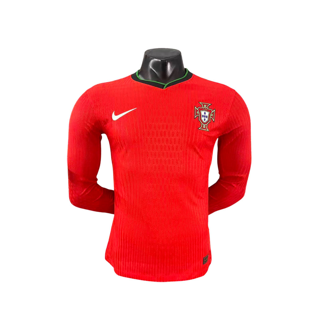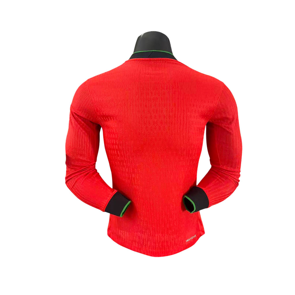 Domáci dres Portugalska pre Euro 2024 od Nike prichádza v klasickej červenej farbe s detailmi v zelenej, čiernej a svetlobéžovej. Zaujme najmä čierny golier s jemným zeleným lemovaním, ktoré dodáva dresu elegantný a moderný nádych.
