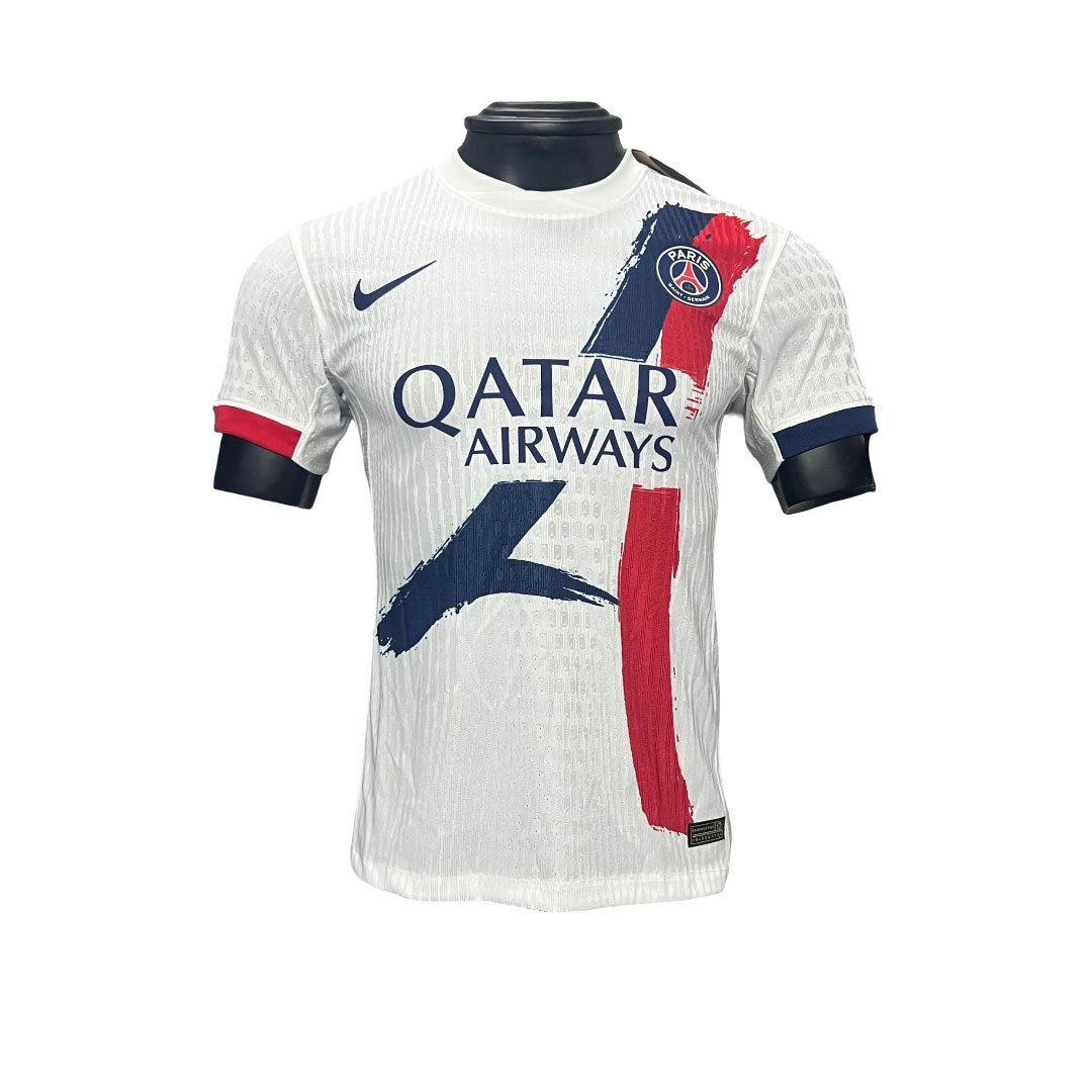 Hosťovský dres PSG 2024/25 prichádza v elegantnej bielej farbe, ktorá tvorí čistý základ pre výrazné grafické prvky. Dizajn okamžite zaujme kontrastnými ťahmi v tmavomodrej a červenej, ktoré prechádzajú prednou časťou dresu a odkazujú na ikonické klubové farby Paríža.