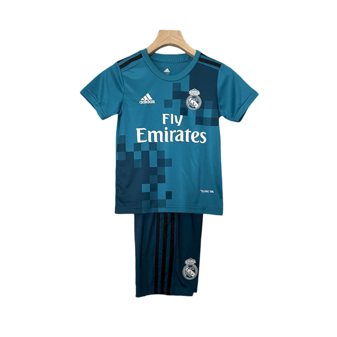 Tento tretí retro detský dres Real Madrid zo sezóny 2017/18 patrí medzi najodvážnejšie dizajny klubu v modernej ére. Tyrkysovo-modrá farba v kombinácii s tmavými detailmi okamžite zaujme a jasne odlišuje tento dres od tradičnej bielej identity Realu.