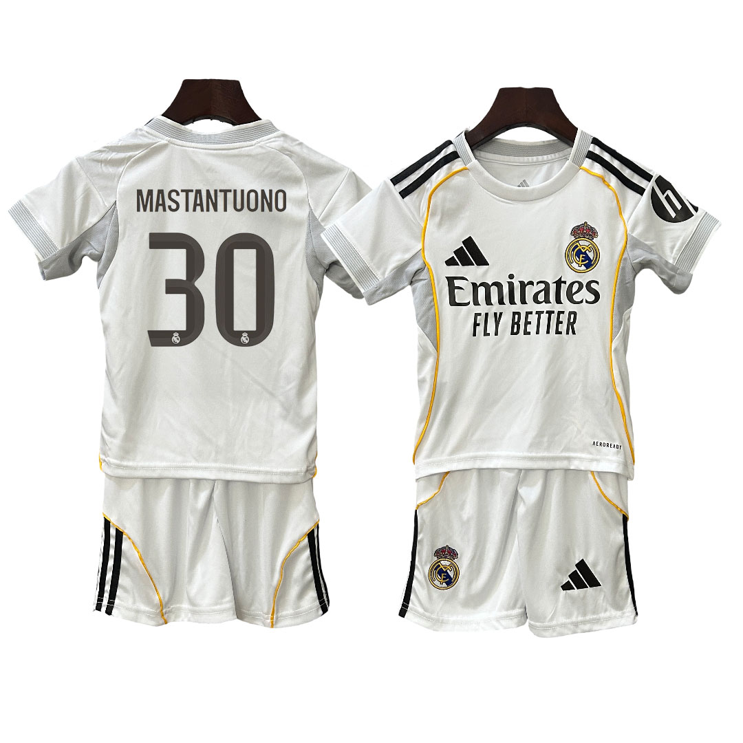 Real Madrid Detská Futbalová Súprava (dres + šortky) už obsahuje potlač mena a čísla „Valverde 8“. Všetko je zahrnuté v cene a priamo natlačené na drese, takže pri objednávke nemusíte nič dopĺňať ani vyberať – stačí si len zvoliť správnu veľkosť.