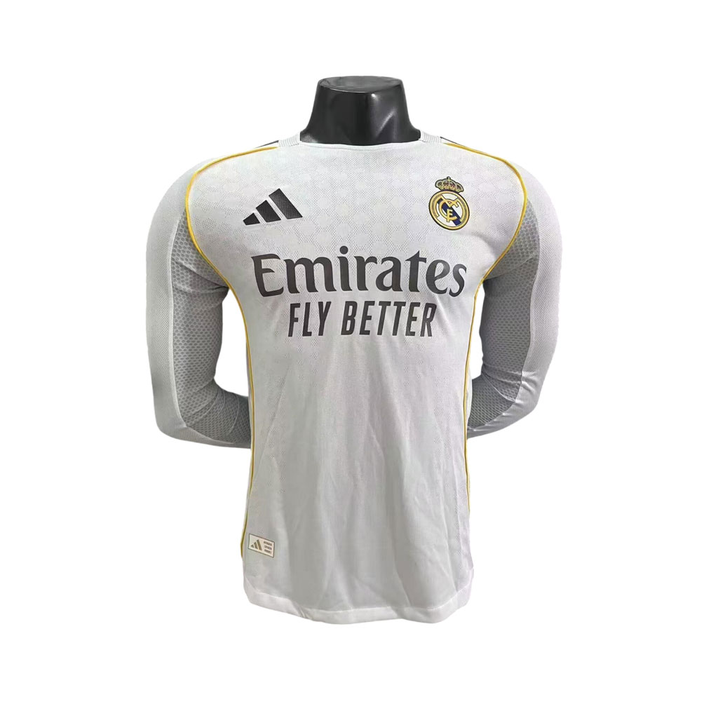 Domáci dres Real Madrid 2025/26 nadväzuje na bohatú históriu „Los Blancos“, keď kombinuje ikonickú bielu farbu s modernými prvkami. Žlté lemovanie pozdĺž bokov a jemné sivé detaily na rukávoch, golieri a bočných paneloch dodávajú dresu elegantný a svieži vzhľad. Čierne logá vytvárajú výrazný kontrast, ktorý pripomína éru galácticos a štýlové outfity zo začiatku 2000-tych rokov.