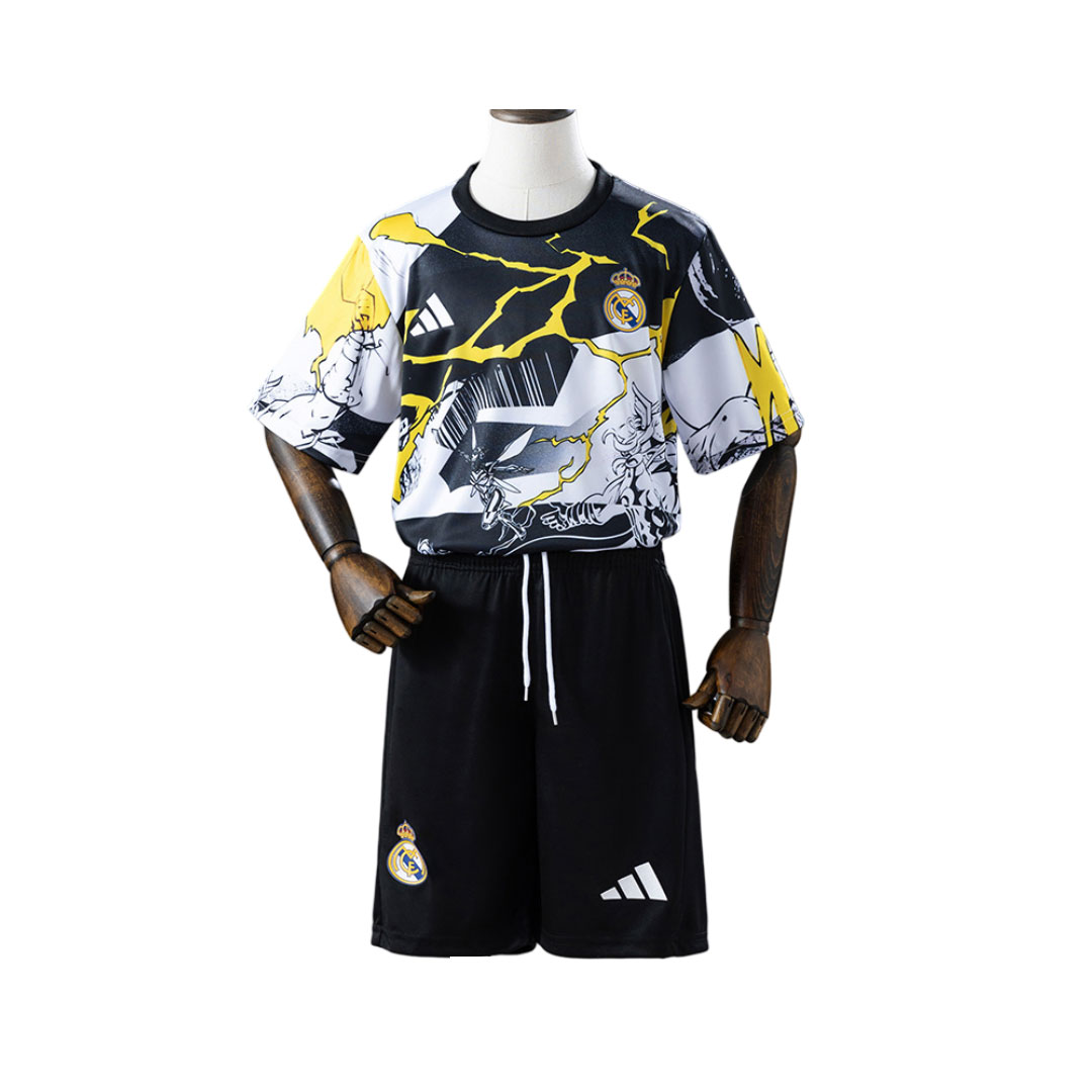 Predná aj zadná strana trička sú pokryté akčnou ilustráciou s efektom bleskov a pohybu, vďaka čomu set pôsobí moderne a hravo. Klubový znak Real Madrid je decentne zakomponovaný do dizajnu, takže futbalová identita zostáva jasne rozpoznateľná aj pri netradičnom spracovaní.