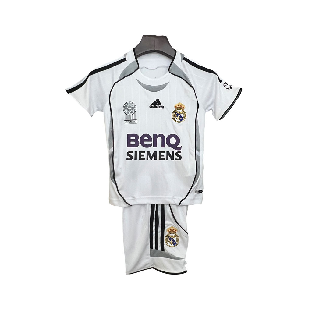 Retro detský domáci dres Real Madrid zo sezóny 2006/07 – tričko a šortky v klasickej bielej farbe. Elegantný dizajn s čiernymi detailmi, pohodlný strih a legendárny vzhľad éry Galácticos.