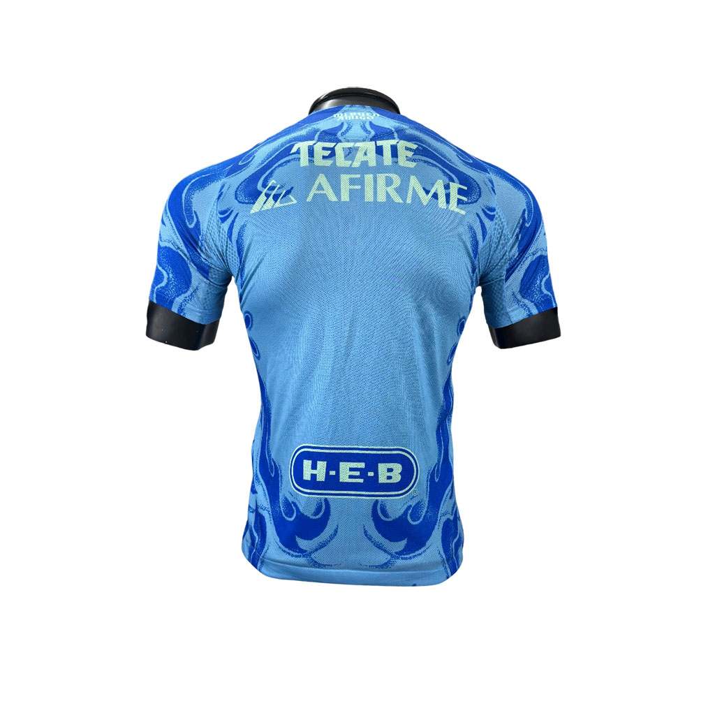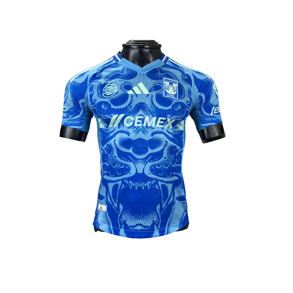 Dres Adidas Tigres 25–26 pre zápasy vonku je prevažne modrý a v strede ho zdobí veľký motív tigrej hlavy v svetlejšom odtieni modrej. Dizajn pripomína farby hosťujúceho dresu z sezóny 22–23, čo mu dodáva nádych tradície a nostalgie.