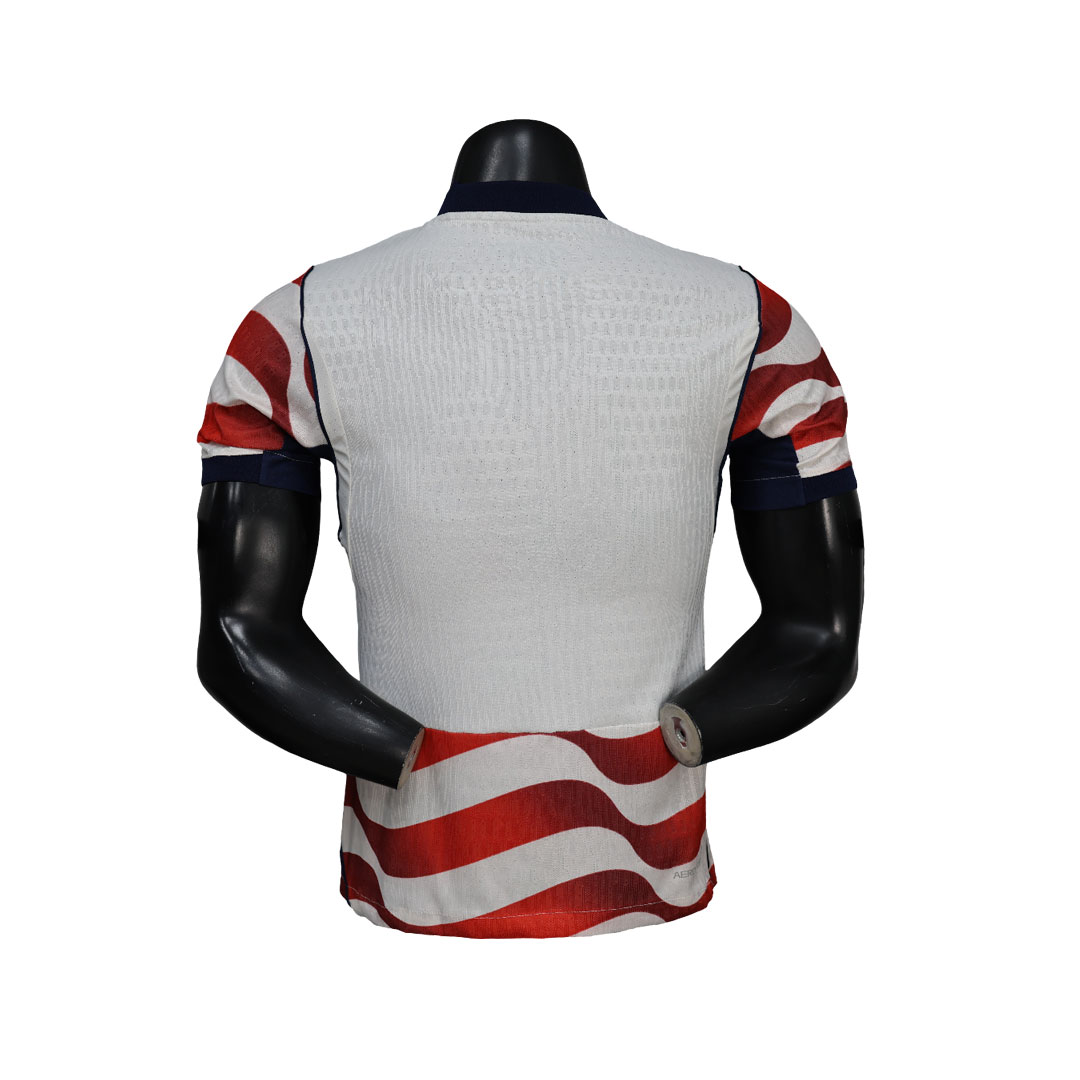 Dizajn dopĺňajú tmavomodré detaily – golier, manžety rukávov a logo, ktoré odkazujú na farby americkej vlajky. Celkový vzhľad tak spája národnú identitu s moderným spracovaním kolekcie World Cup 2026.