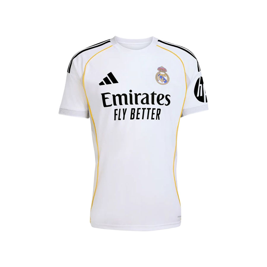 Domáci dres Real Madrid 2025/26 nadväzuje na bohatú históriu „Los Blancos“, keď kombinuje ikonickú bielu farbu s modernými prvkami. Žlté lemovanie pozdĺž bokov a jemné sivé detaily na rukávoch, golieri a bočných paneloch dodávajú dresu elegantný a svieži vzhľad. Čierne logá vytvárajú výrazný kontrast, ktorý pripomína éru galácticos a štýlové outfity zo začiatku 2000-tych rokov.